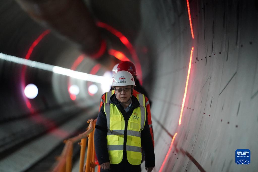 梅東冬在雄安新區(qū)至北京大興國際機(jī)場(chǎng)快線(R1線)一標(biāo)段項(xiàng)目地下隧道巡查(1月18日攝)。