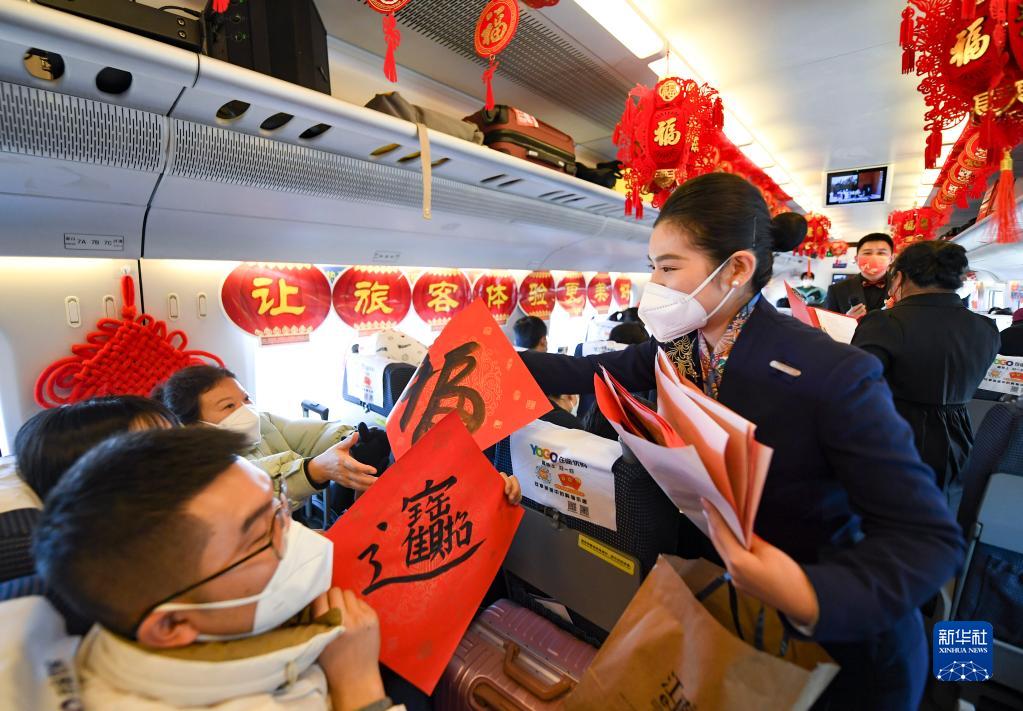 臨近春節,中國鐵路蘭州局集團有限公司銀川客運段將部分列車車廂裝扮一新,組織青年職工在列車上表演自編的節目,為旅客送上小禮物,讓人們將旅途中的歡樂帶回家。