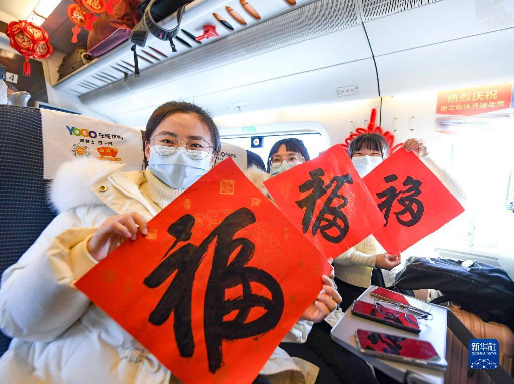 1月19日,在由銀川開往蘭州的D8933次列車上,旅客展示收到的“福”字。