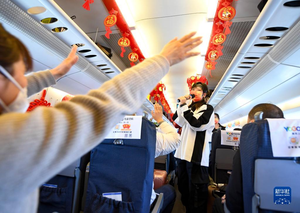 臨近春節,中國鐵路蘭州局集團有限公司銀川客運段將部分列車車廂裝扮一新,組織青年職工在列車上表演自編的節目,為旅客送上小禮物,讓人們將旅途中的歡樂帶回家。