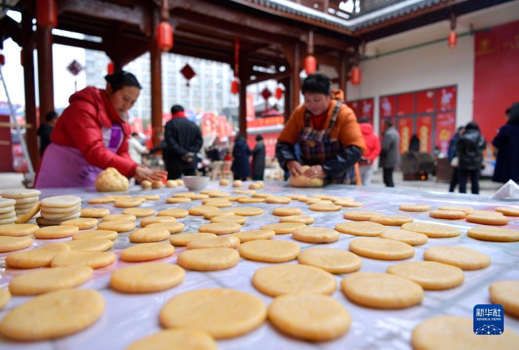 1月18日,在湖北省宣恩縣舉行的鄉(xiāng)賢大會(huì)上,人們制作當(dāng)?shù)貍鹘y(tǒng)美食糍粑。