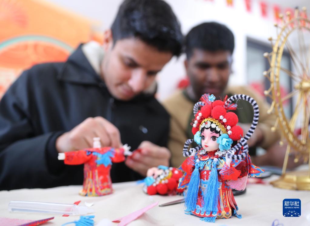 1月19日,山東科技大學(xué)的留學(xué)生在制作絹人工藝品。