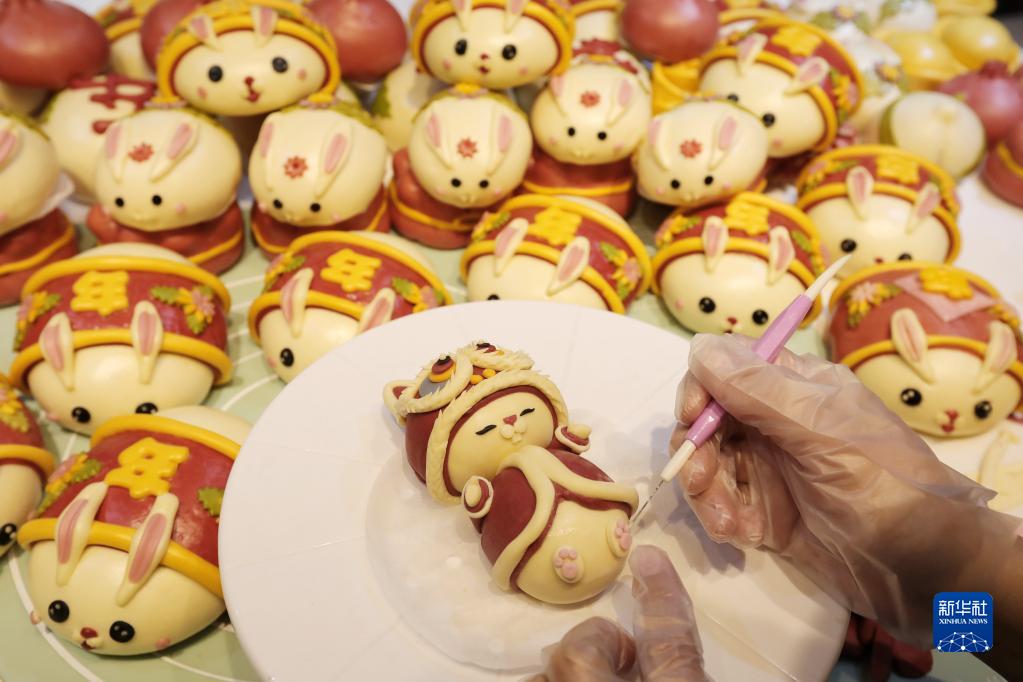春節(jié)臨近,安徽省淮北市一些面點師以兔為主題,創(chuàng)作出各式各樣的“萌兔”花饃,供應(yīng)節(jié)日市場,迎接新春佳節(jié)的到來。