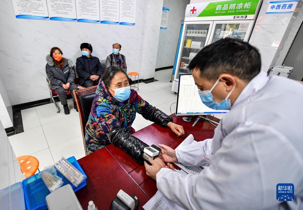 1月19日,北川縣曲山鎮任家坪村、石椅村聯合衛生室村醫趙太安(右一)在村衛生室為前來問診的村民測量血壓。