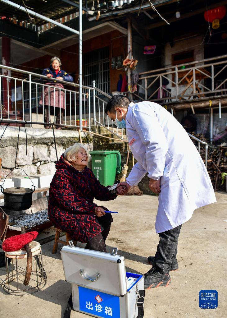 1月19日,在北川縣曲山鎮石椅村,村醫趙太安來到93歲的劉桂珍老人家走訪。