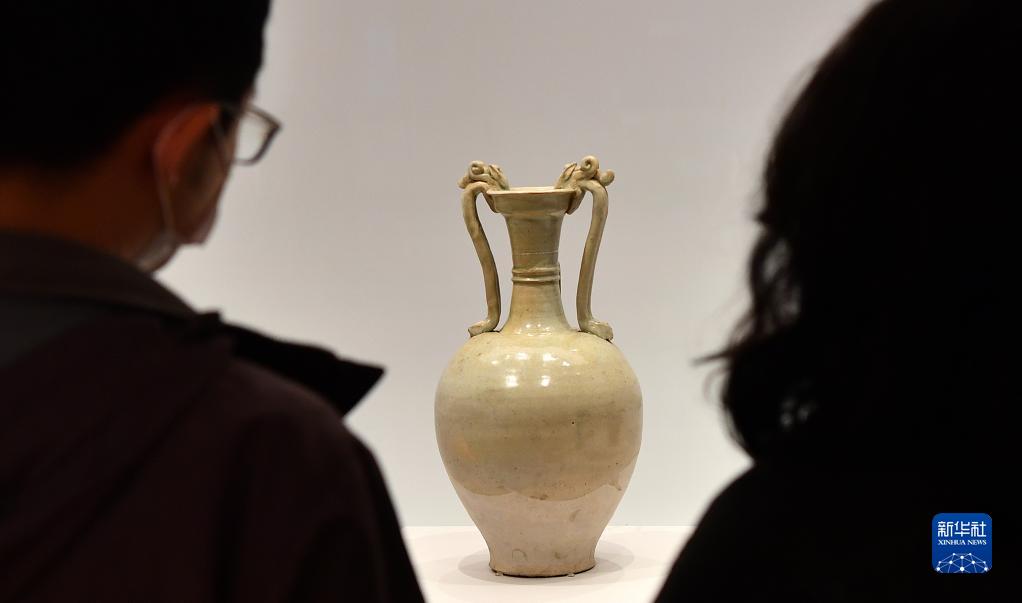1月19日,觀眾在觀看“白釉龍耳盤口瓶”。