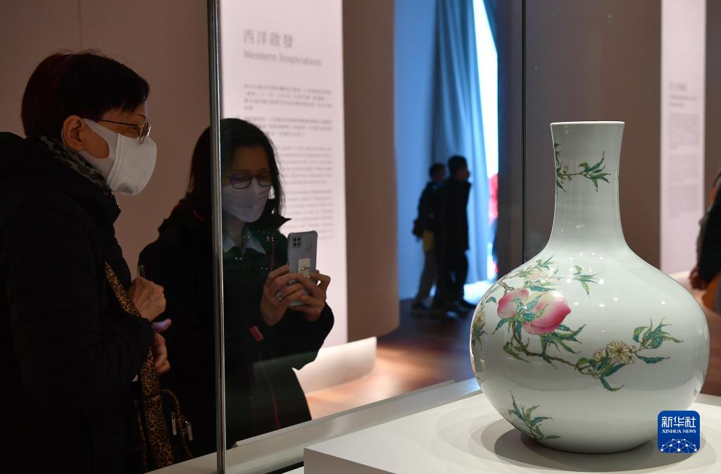 1月19日,觀眾在觀看“粉彩九桃結(jié)樹圖天球瓶”。