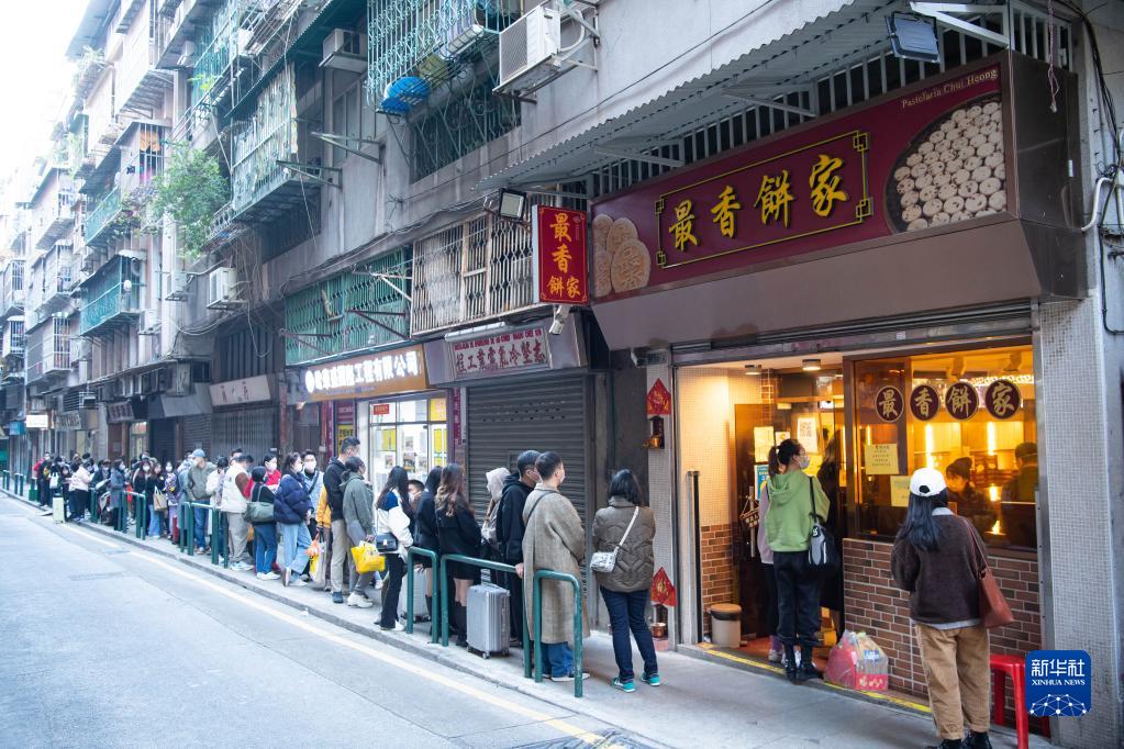 1月18日,游客在澳門“最香餅家”店外排隊購買手工炭燒杏仁餅。