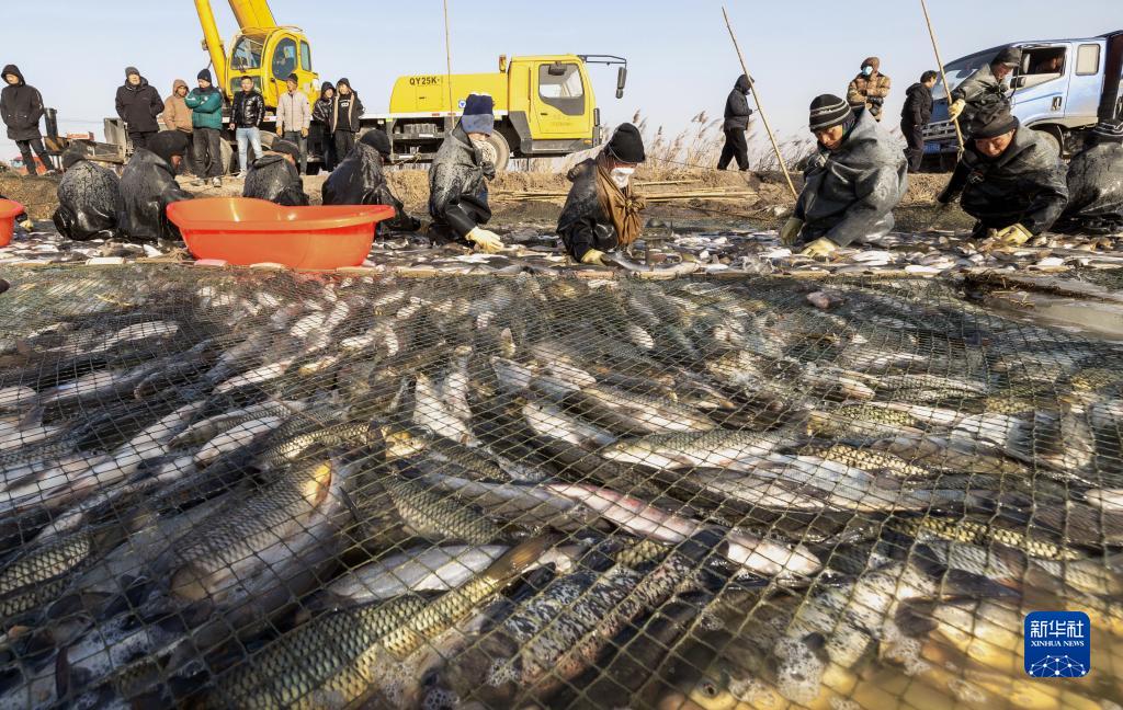 連日來,河北省唐山市豐南區(qū)的水產(chǎn)養(yǎng)殖戶們忙著在池塘內(nèi)破冰捕魚,以供應春節(jié)市場。