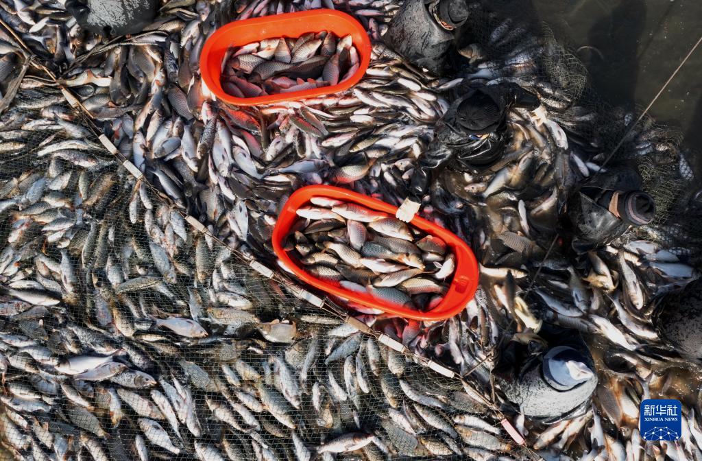 1月20日,唐山市豐南區老鋪村的村民在魚塘捕撈淡水魚(無人機照片)。