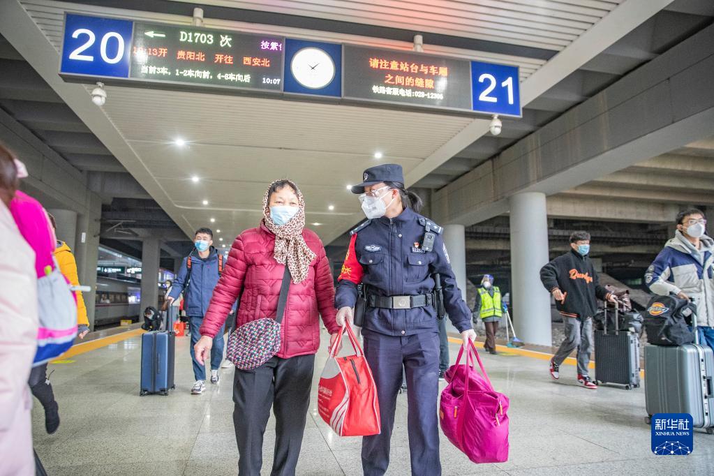 1月16日,在重慶西站列車站臺,重慶鐵路公安處乘警支隊“芳華”女子乘務警組的朱小麗帶領旅客前往候車位置。