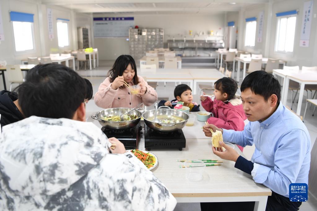 1月19日,李輝(右一)一家和項目部其他留守人員一同吃午飯。