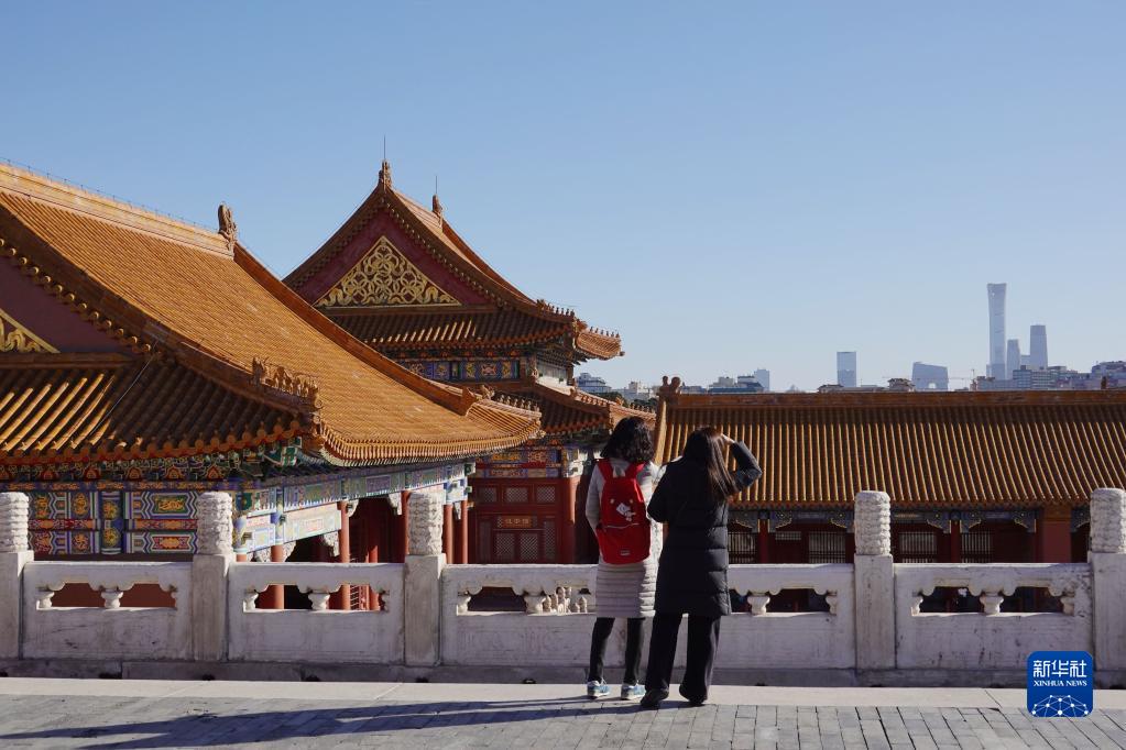 春節前夕,不少游人來到北京故宮博物院,在藍天暖陽下感受冬日故宮的獨特韻味。