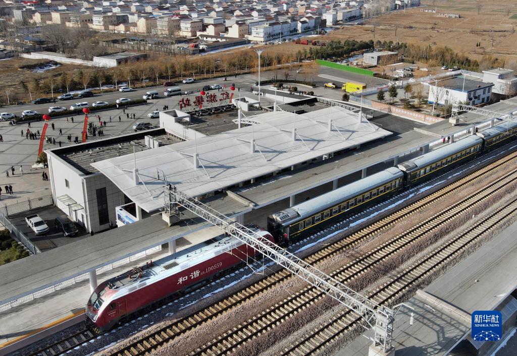 1月20日,“紅旗渠”號列車停靠在紅旗渠站(無人機照片)。