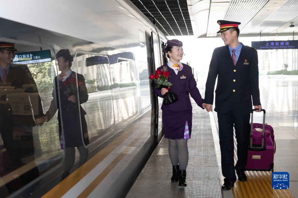 王恒和路延是鐵路上海客運段的一對夫妻職工,王恒是高鐵四車隊的一名列車長,丈夫路延是高鐵三車隊的一名列車員。兩人在學校相識,從校服到鐵路制服,今年已經是他們攜手奮戰的第七個春運了。