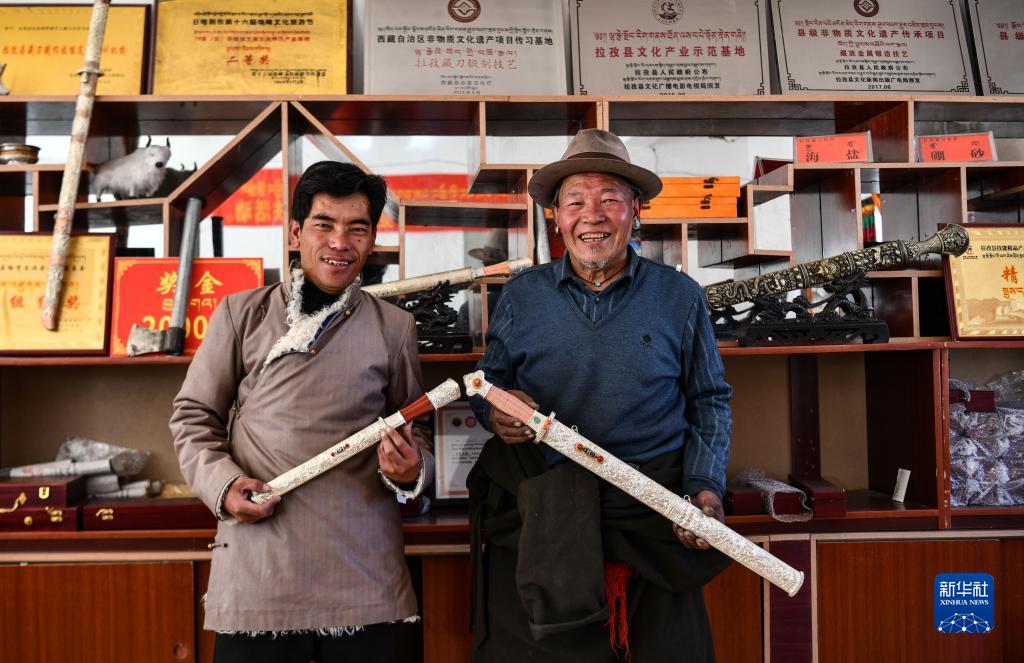 普達(dá)瓦(右)和兒子多吉占堆一起展示制作好的拉孜藏刀(1月19日攝)。