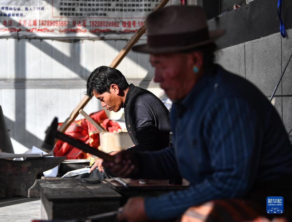 普達瓦(右)和兒子多吉占堆一起制作拉孜藏刀(1月19日攝)。