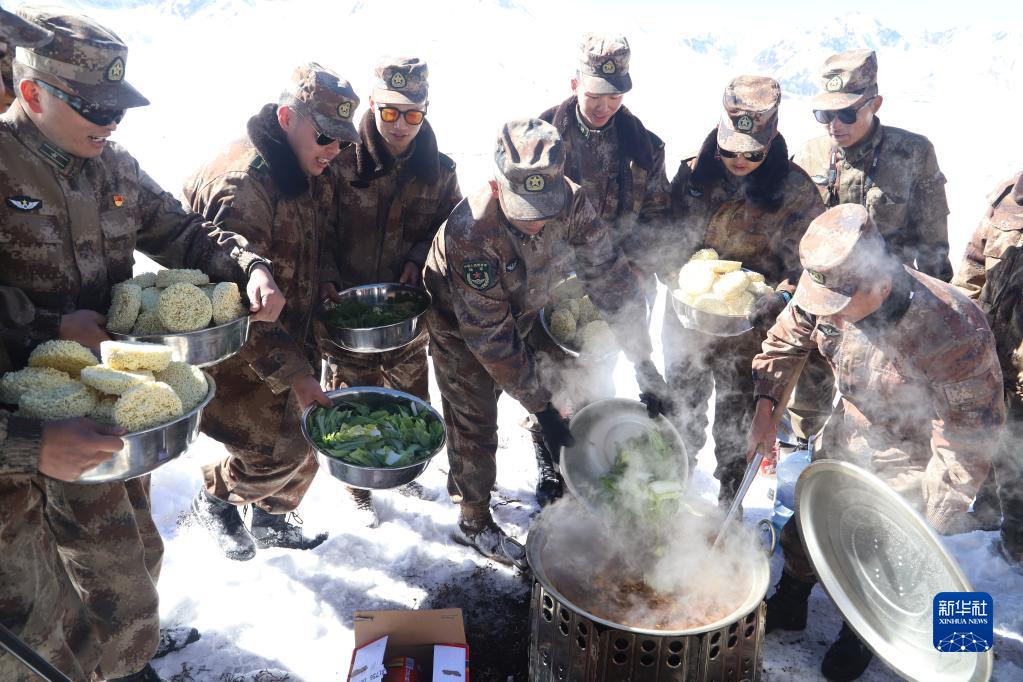 西藏軍區川藏兵站部某運輸旅官兵任務途中進行自我炊事保障(2022年11月18日攝)。新華社發(賈宇翔 攝)