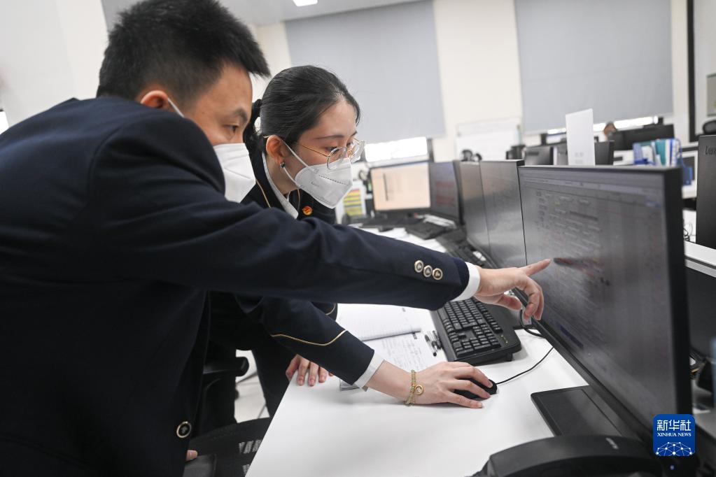 1月19日,在南方航空海南分公司現(xiàn)場(chǎng)運(yùn)行中心,簽派員王秋遠(yuǎn)(左)與伍秋研究當(dāng)日可能延誤航班的運(yùn)力調(diào)配。