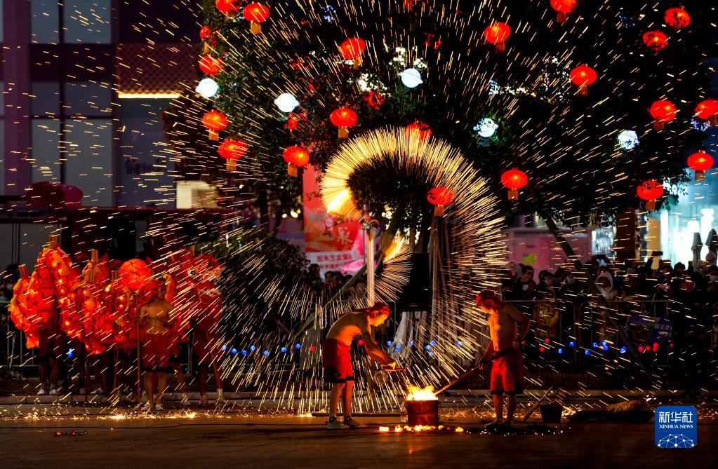 1月18日,重慶市銅梁區的龍城天街的廣場上,銅梁火龍隊的隊員們表演銅梁火龍。