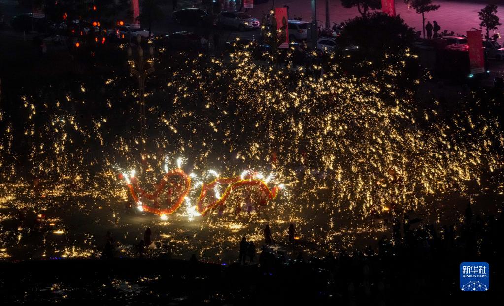 1月18日,重慶市銅梁區(qū)的龍城天街的廣場(chǎng)上,銅梁火龍隊(duì)的隊(duì)員們表演銅梁火龍。
