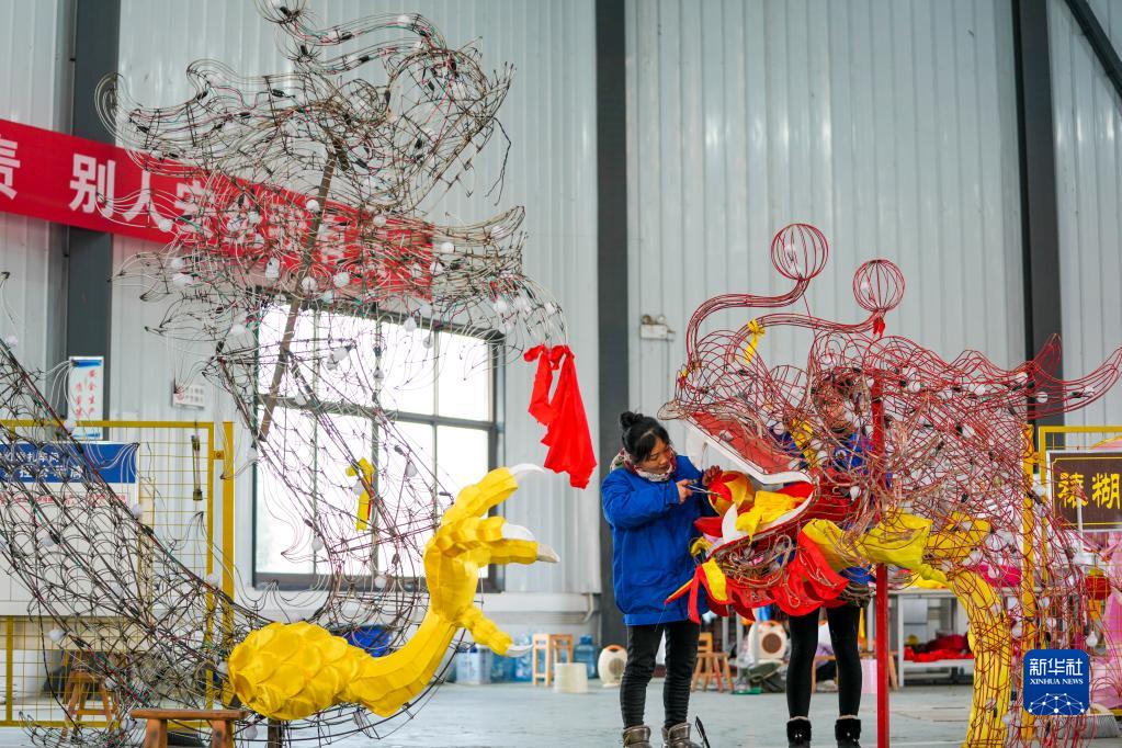 1月19日,在重慶市銅梁區太平鎮坪漆村龍燈彩扎基地的鄉村振興車間內,兩名村民制作銅梁龍燈。