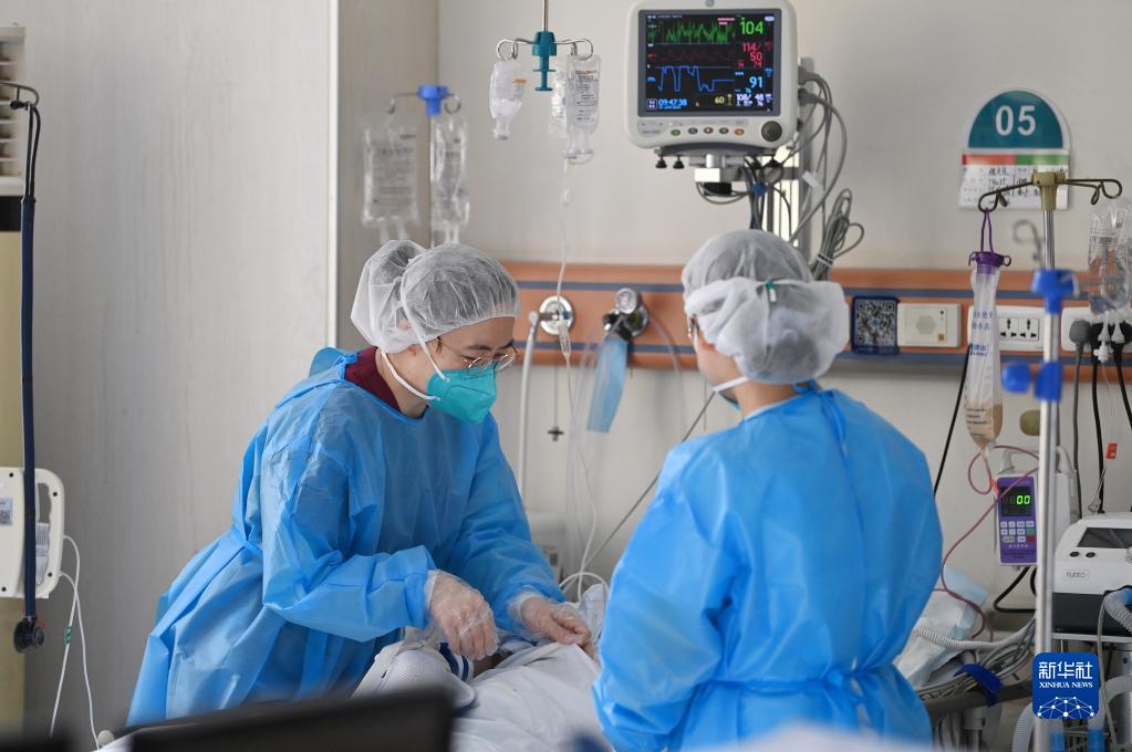 1月21日,在天津醫科大學總醫院呼吸與危重癥醫學科,兩位醫護人員在患者床前工作。