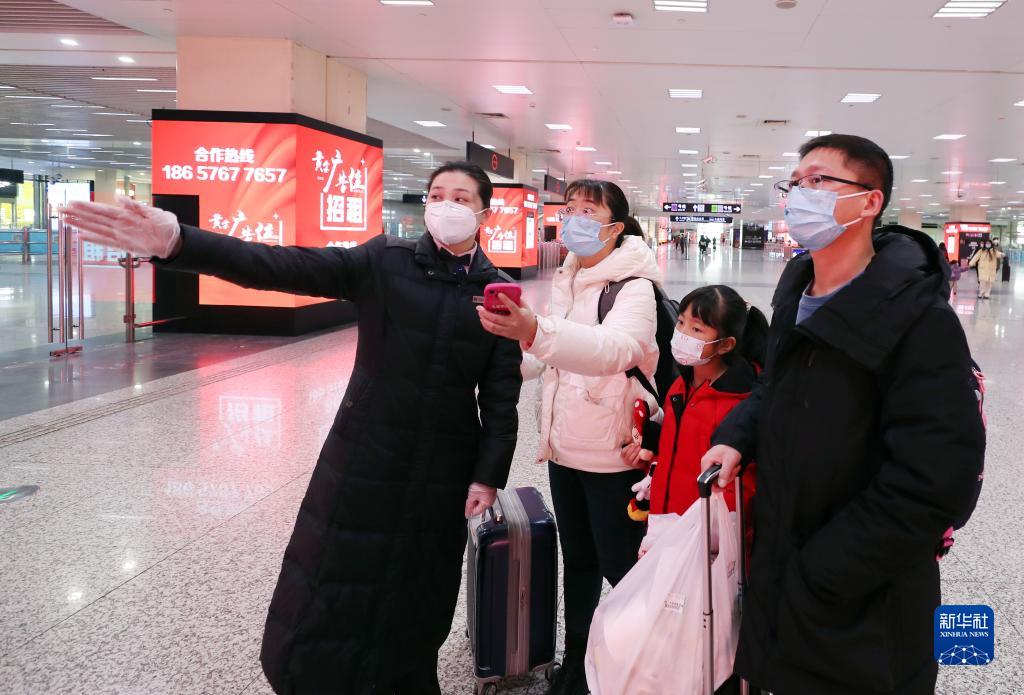 1月21日,申通地鐵集團(tuán)運(yùn)一公司員工高煜(左一)在地鐵上海虹橋火車站站巡視時(shí)為旅客指路。