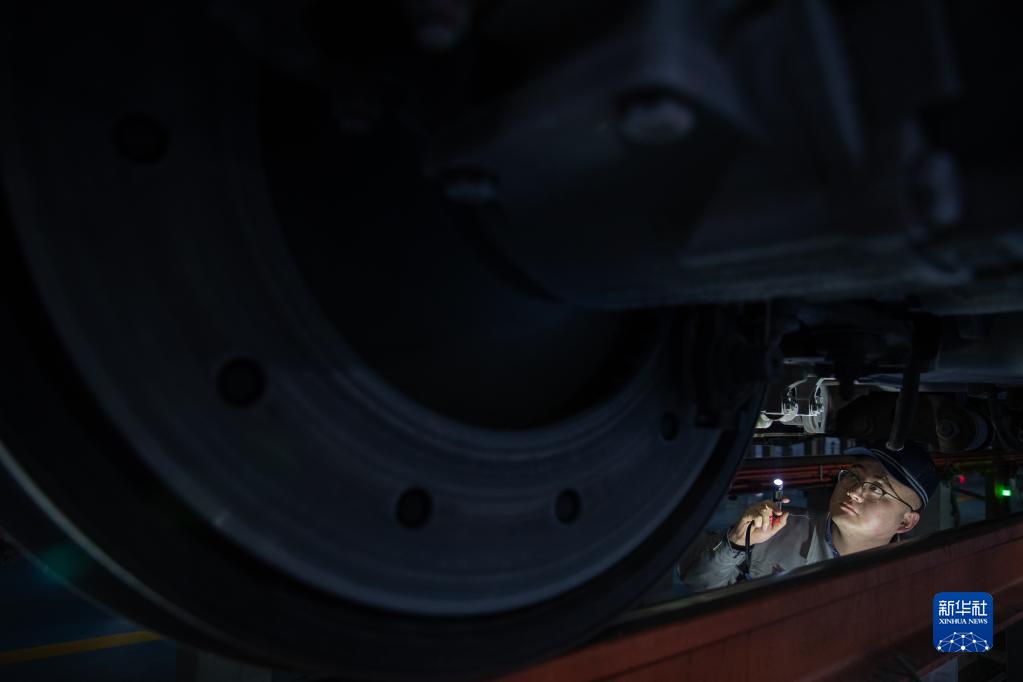 1月21日,在中國鐵路哈爾濱局集團有限公司哈爾濱動車段檢修車間,地勤機械師苗壯檢查車輛。