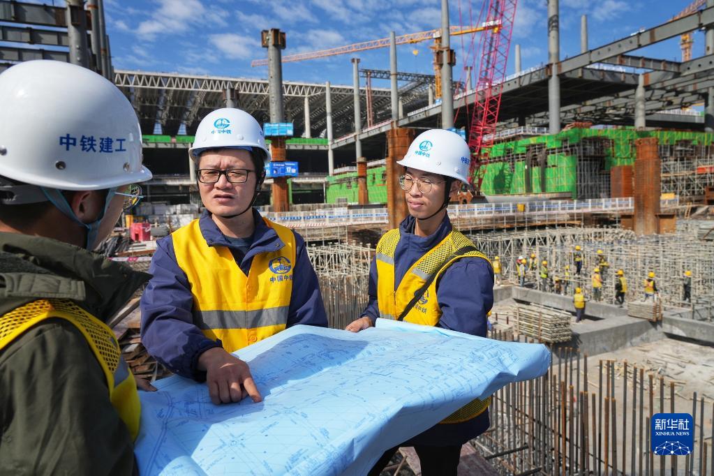 1月21日,中鐵建工廣州白云火車站項目總工程師劉俊(中)檢查工程進度。