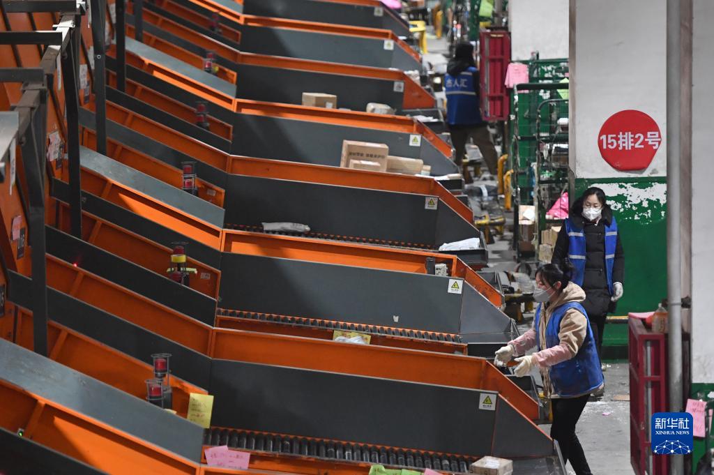 1月21日,在中國郵政速遞物流鄭州郵件處理中心,工作人員在進(jìn)行分揀作業(yè)。