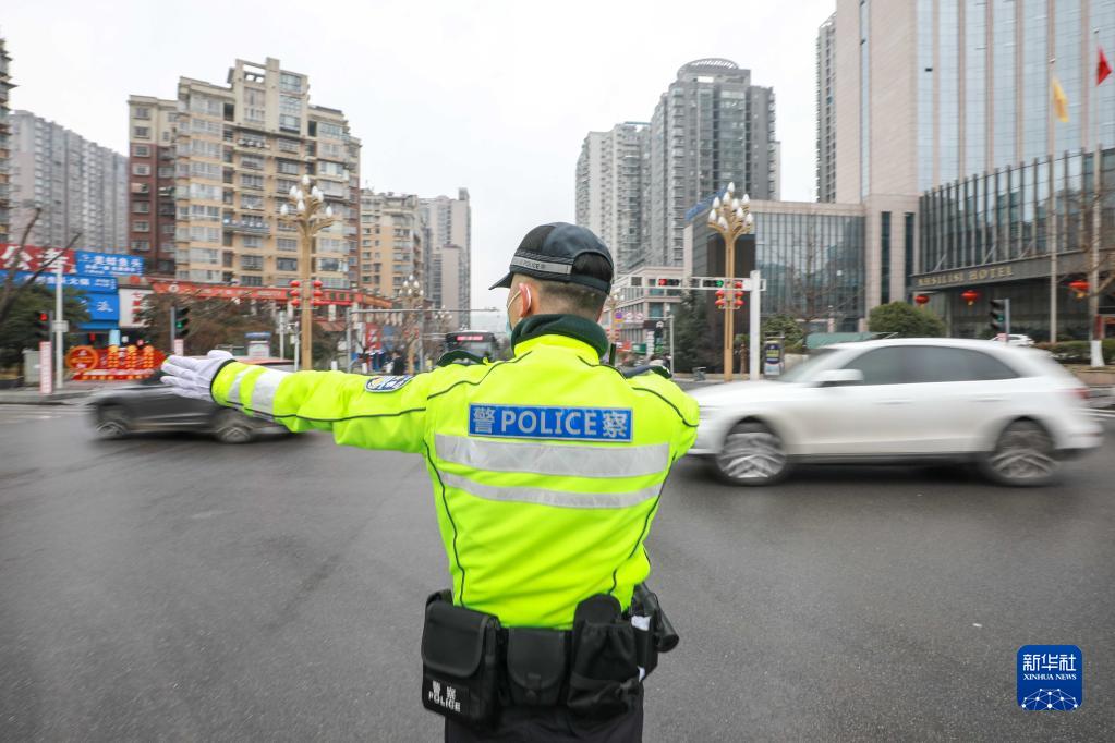 1月21日,貴州省畢節市七星關區交警大隊機動中隊隊員指揮車輛通行。