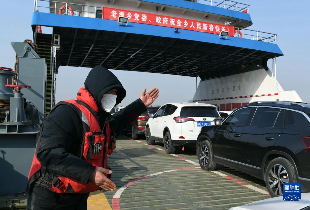 1月21日,輪渡值班員在安徽省銅陵市義安區(qū)老洲長江渡口引導(dǎo)過江車輛上輪渡。