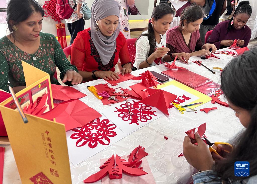 1月18日,中國文化愛好者在毛里求斯首都路易港體驗中國剪紙。
