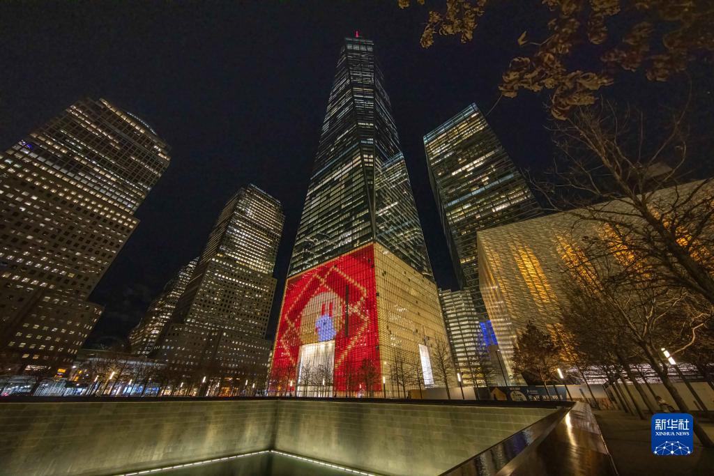 1月20日,美國紐約世貿(mào)中心一號(hào)樓亮起中國春節(jié)主題燈光。