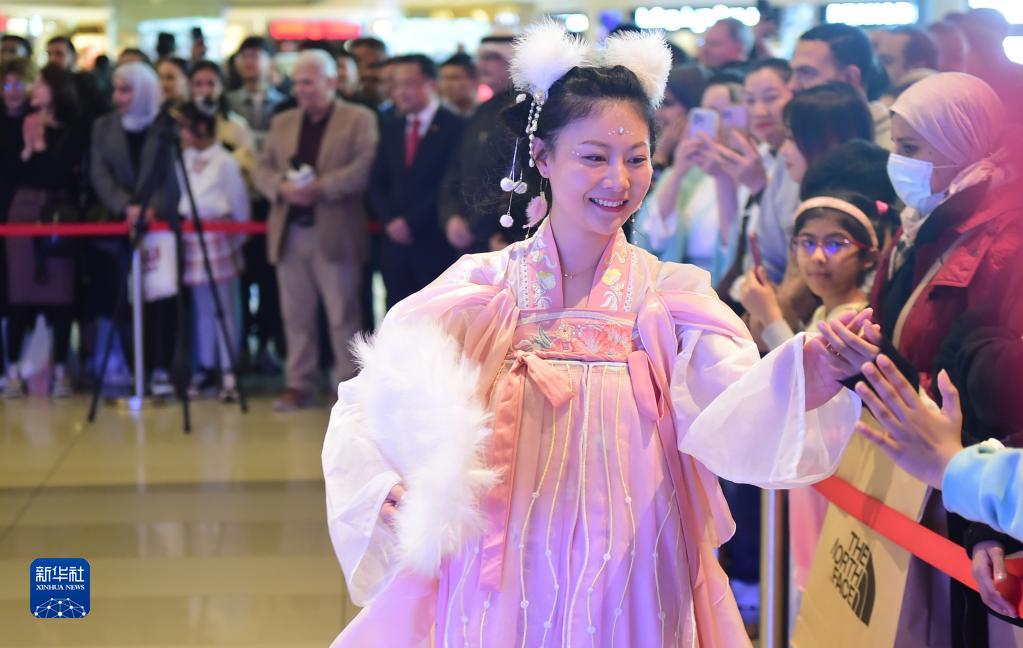 1月20日,在科威特費爾瓦尼耶省舉行的迎接中國農歷春節活動上,一名女子展示中國傳統服飾。