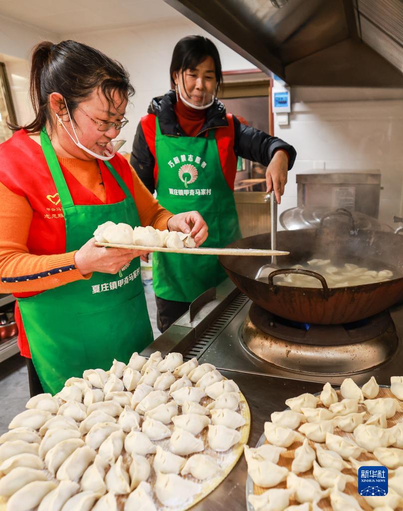 1月21日,在山東省榮成市夏莊鎮甲夼馬家村暖心食堂,志愿者煮餃子。
