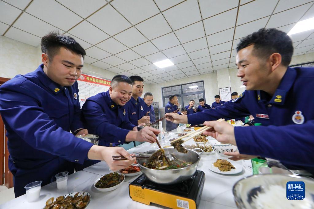 1月21日,消防員在貴州省黔東南苗族侗族自治州岑鞏縣消防救援大隊食堂吃年夜飯。
