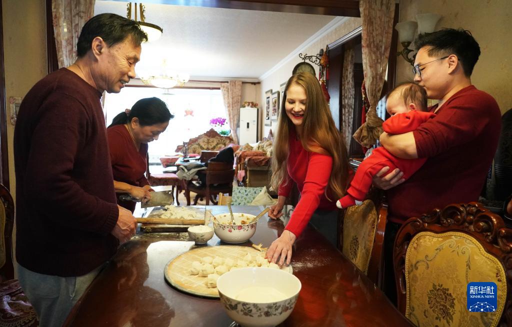 1月21日,來自德國的張珍妮(左三)與丈夫張鼎然(右一)在北京的家中和家人一起包餃子。