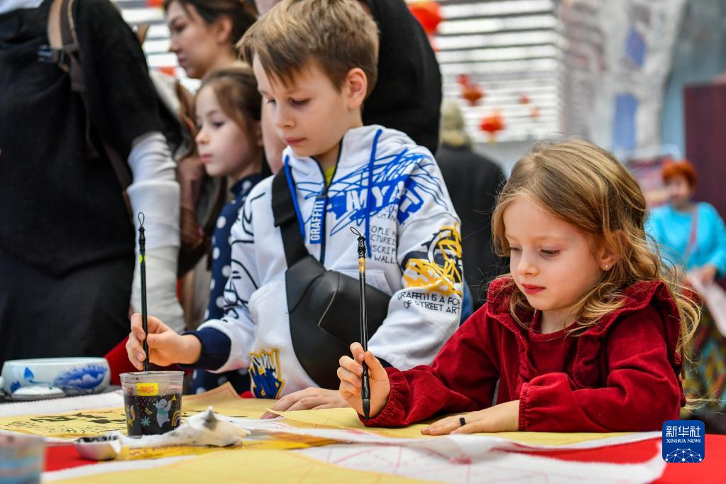 1月21日,兒童在俄羅斯莫斯科的迎新春活動(dòng)上學(xué)習(xí)書法。