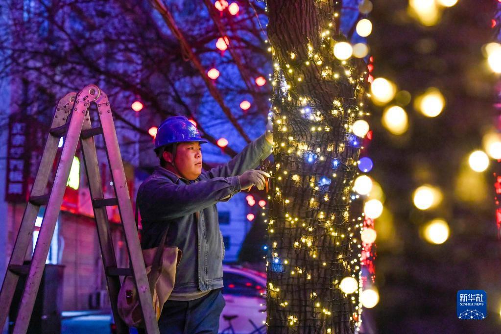1月21日清晨,工作人員在河北省遷西縣城區路旁檢修樹干上的串燈。
