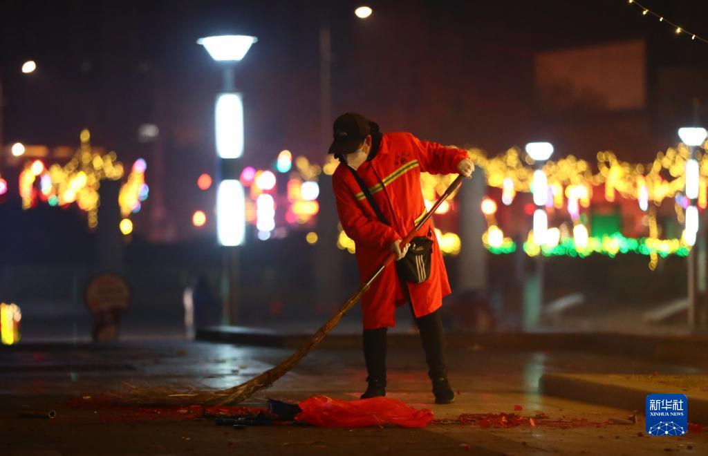 1月22日,環衛工人在山東省滕州市龍泉廣場清掃路面。