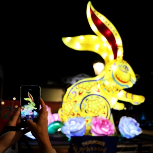 1月21日晚,游客在英國倫敦特拉法加廣場拍攝兔子彩燈。