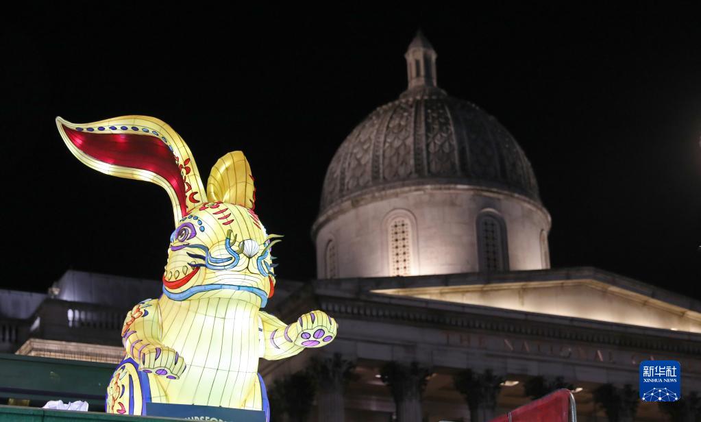 1月21日晚,兔子彩燈在英國倫敦特拉法加廣場點亮。