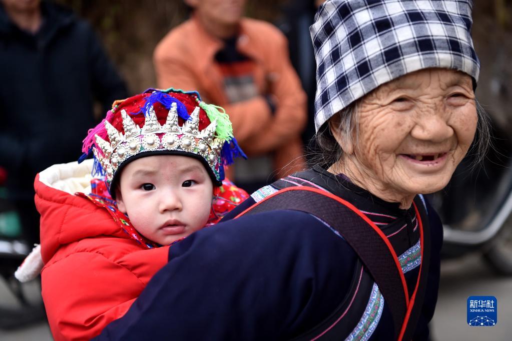 1月22日,在貴州省榕江縣栽麻鎮(zhèn)歸柳村,老人背著小朋友觀看鬧新春活動(dòng)。