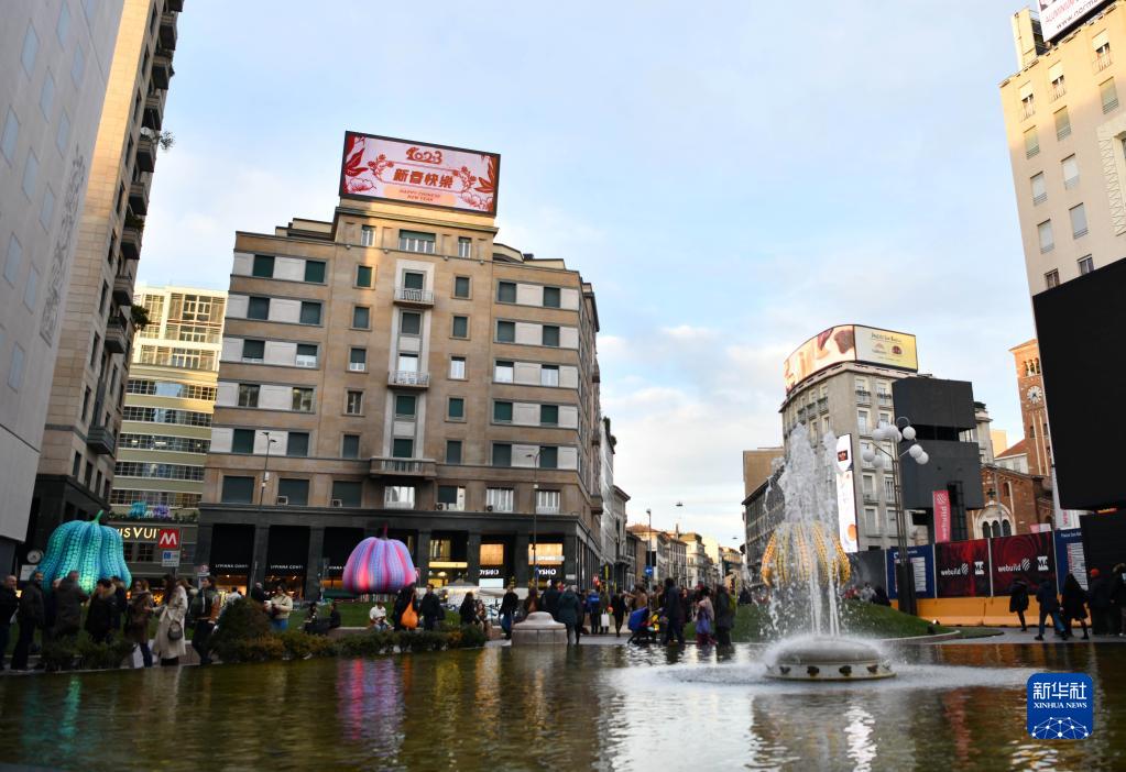 1月21日,意大利米蘭圣巴比拉廣場建筑上方的大屏幕循環播放兔年春節動畫。