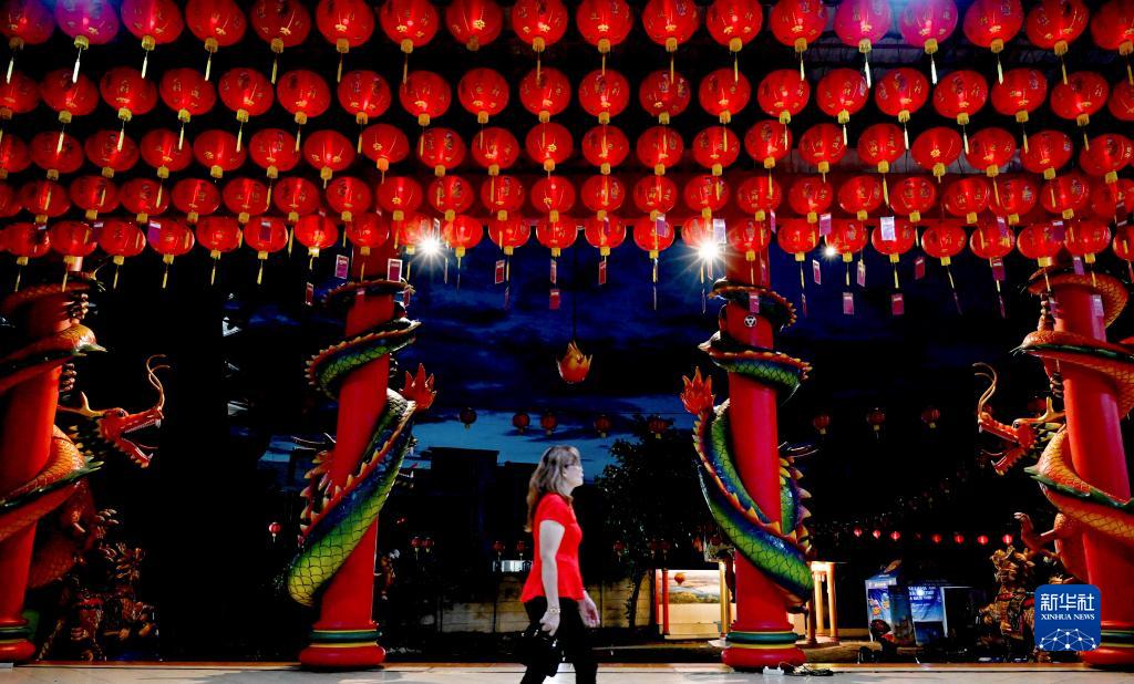 1月21日,女子從印度尼西亞萬丹一處寺廟內的春節裝飾旁走過。