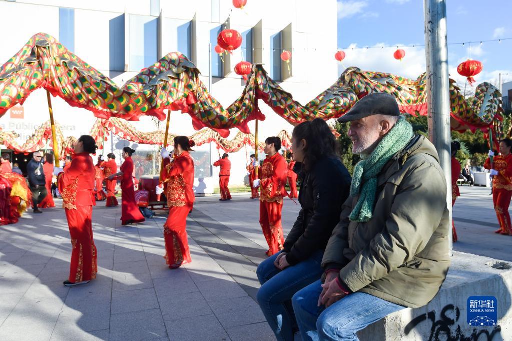 1月20日,西班牙馬德里當(dāng)?shù)孛癖娪^看舞龍表演。