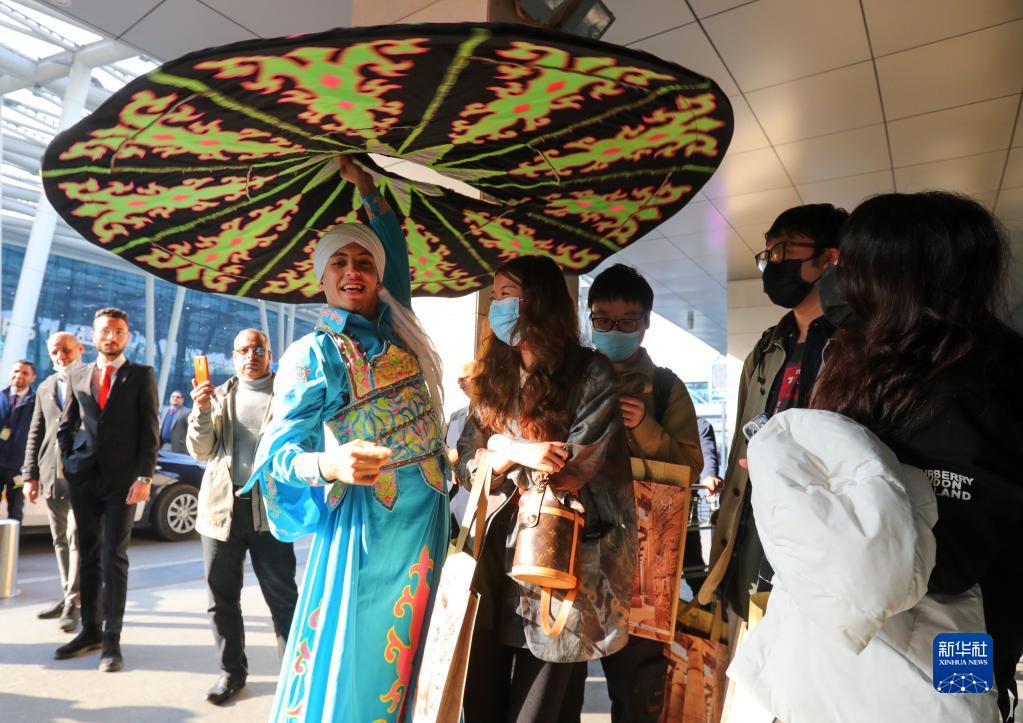 1月20日,在埃及開羅國際機場,演員表演埃及傳統舞蹈大裙舞迎接中國游客。