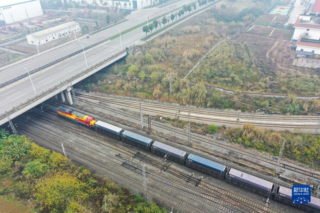 1月22日,兔年首趟西部陸海新通道鐵海聯(lián)運(yùn)班列從重慶團(tuán)結(jié)村中心站發(fā)車(無人機(jī)照片)。